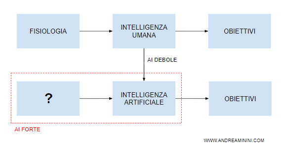 Entrambe le forme di intelligenza hanno obiettivi da raggiungere, sia quella umana che robotica, ma le strade prescelte possono anche essere differenti. Inoltre, non è nemmeno detto che l'intelligenza umana abbia gli stessi obiettivi dell'intelligenza artificiale. Molti obiettivi di un uomo sono dettati dalla sua fisiologia umana.
