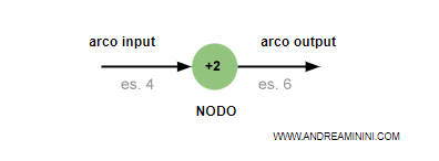 Gli archi in entrata sui nodi veicolano i valori di input ( es. 4 ) mentre gli archi in uscita trasmettono il risultato dell'operazione in avanti ( es. 4+2 = 6 ).