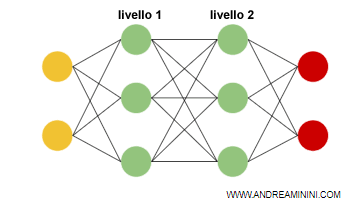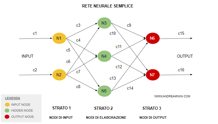 Nota. Una rete neurale semplice è composta da un solo strato di nodi intermedi. Quando ci sono più strati intermedi si parla di rete neurale multistrato ( es. deep learning ).
