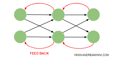 - Propagazione all'indietro ( feed-back o retroazione ). In questo caso, il risultato viene trasmesso a uno dei nodi dello strato precedente, uno di quelli a sinistra. La retroazione è una delle caratteristiche delle reti più complesse, le quali possono anche diventare cicliche durante l'elaborazione dei dati ( reti neurali ricorrenti ).