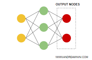 - Nodi di uscita ( output nodes ). Sono i nodi di output. Si trovano a destra, all'uscita della rete neurali. Sono usati per consegnare il risultato dell'elaborazione.
