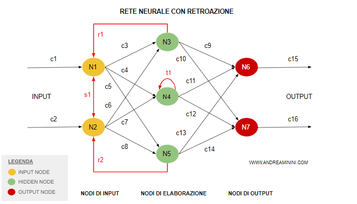 I nodi N3 e N5 hanno, invece, un arco di retroazione ( r1 e r2 ) con un nodo dello strato precedente ( N1 e N2 ).