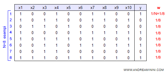 Nota. Nella precedente tabella di training set sono presenti N=8 esempio. Pertanto, il peso iniziale di ciascun elemento del vettore w è pari a 1/N ossia 1/8=0,125.