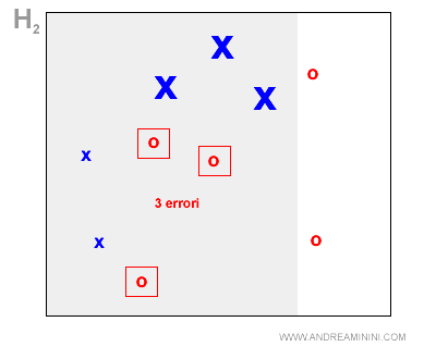 La seconda ipotesi seleziona tutte le X ma commette tre errori ( le tre O ).