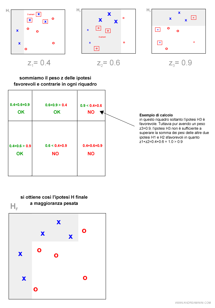 Per ciascun esempio, la risposta dell'algoritmo è quella che ottiene la maggioranza sommando i pesi (z) delle ipotesi.