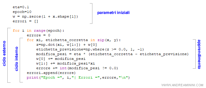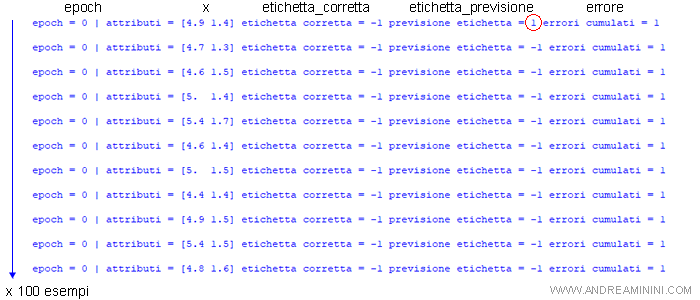 Il ciclo interno legge gli attributi x degli esempi e l'etichetta giusta ( etichetta_corretta ) dell'insieme di training.