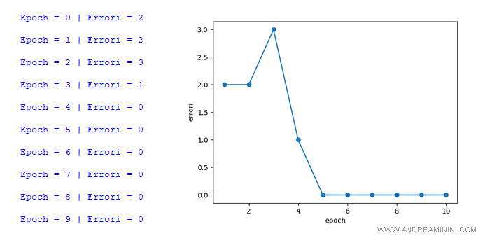 Il numero degli errori è diminuito dopo ogni turno, ad eccezione della terza epoch, fino ad azzerarsi del tutto.