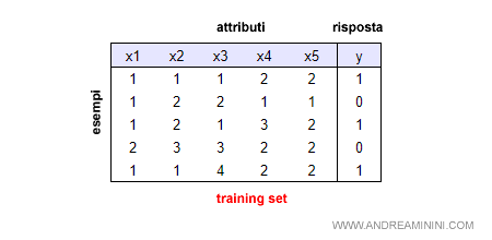 Nota. Un training set addestra la macchina a prendere una decisione corretta tramite degli esempi di addestramento. Pertanto, ogni training set risponde a una domanda specifica ( es. se la domanda è "giro a destra?", la risposta y può essere si (y=1) oppure no (y=0). E così via.
