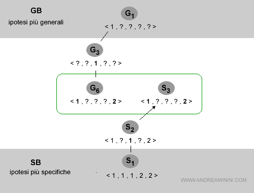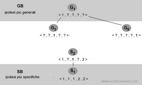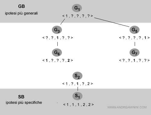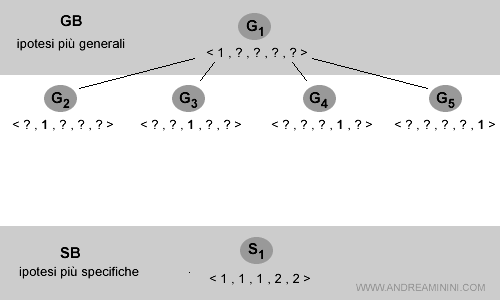 Nota. Le precedenti ipotesi sono tutte le specializzazioni di G1 consistenti e più generiche di S1 dove S1 è uguale < 1, 1 , 1 , 2 , 2 >.
