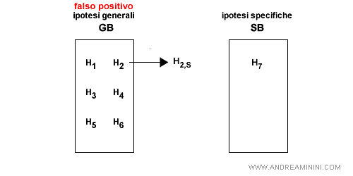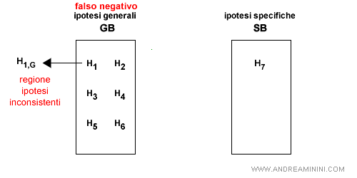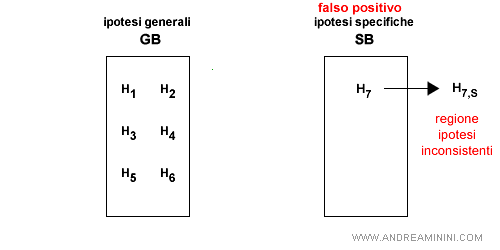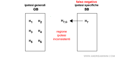- Falso positivo per SB. L'ipotesi S è troppo generica per l'esempio. Non essendo possibile specializzare ulteriormente l'ipotesi, perché uscirebbe dalla sinistra di SB, si elimina l'ipotesi da SB.
