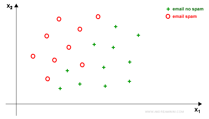 Nota. In questo caso ho volutamente creato un dataset training molto semplice, per spiegare il funzionamento della classificazione automatica. In realtà, le caratteristiche (x) da considerare sono molte di più. Al momento è importante soprattutto sottolineare che nell'apprendimento supervisionato è il supervisore a scegliere le caratteristiche da analizzare. Non è la macchina a sceglierle.
