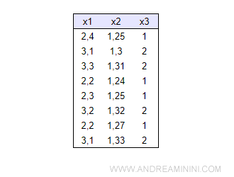 In questi dati sono presenti tre caratteristiche x1, x2, x3.