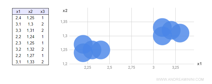 Per vederla meglio, escludo momentaneamente il dato x3 e rappresento i dati x1, x2 su un diagramma cartesiano.