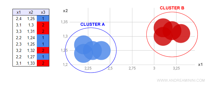Nota. Questo è un semplice esempio a due dimensioni ma rende l'idea del funzionamento. In realtà, il clustering è particolarmente utile quando è applicato a banche dati multidimensionali. Dove l'occhio umano non può fare nulla.