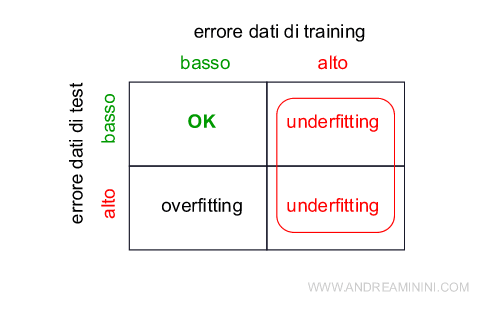 - Se l'errore sui dati di training è elevato, c'è sicuramente un problema di underfitting. Il modello ha generalizzato troppo.