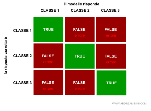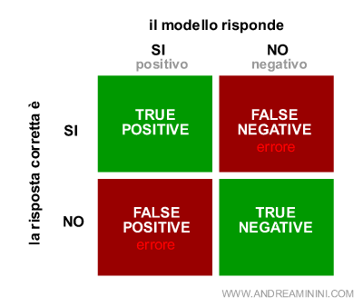 Nota. In questo esempio ho usato un semplice classificatore binario che si limita a classificare un oggetto tra due classi (SI o NO). E' il principio base su cui si basano molti modelli diagnostici e i software antispam e antivirus. Il concetto può comunque essere esteso anche ai classificatori multiclasse tramite la matrice di confusione (confusion matrix).