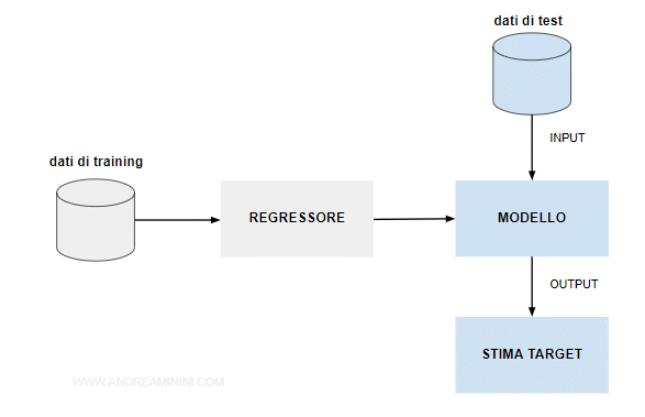 L'algoritmo di apprendimento (regressore) elabora il dataset in input e produce in output un modello previsionale in grado di calcolare il prezzo a partire dalle caratteristiche.