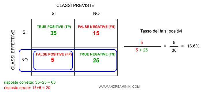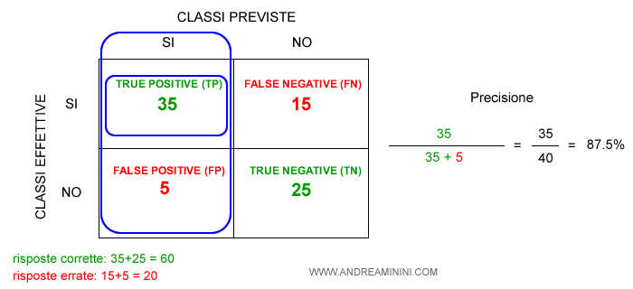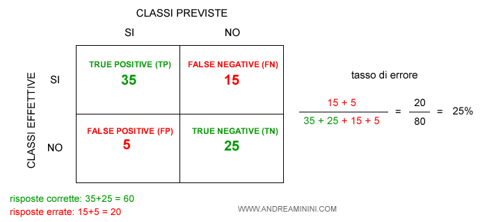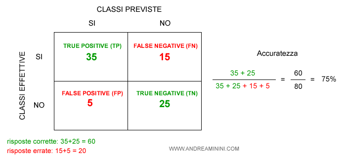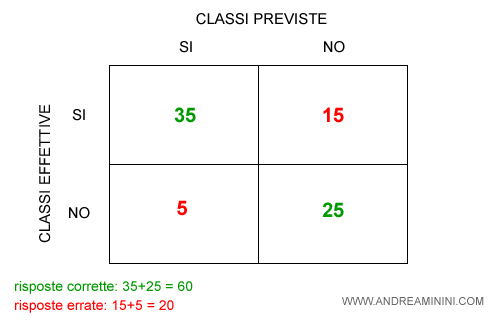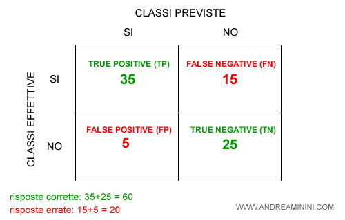 Ad esempio, il modello analizza 80 email e le classifica spam/no spam. In 60 casi il modello classifica correttamente mentre in 20 sbaglia.