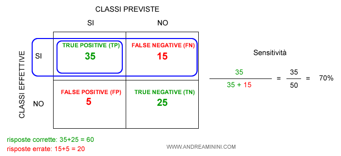Se la classe prevista è SI ma è diversa dalla classe effettiva, si tratta di un caso di false positive (falso positivo). Il modello ha sbagliato a rispondere SI. - False negative (FN)