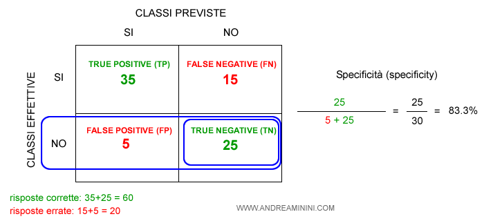 La specificità (specificity) è la percentuale delle previsioni negative corrette (TN) sul totale delle istanze negative. Varia da 0 (peggiore) a 1 (migliore). $$ SP = \frac{TN}{TN+FP} $$