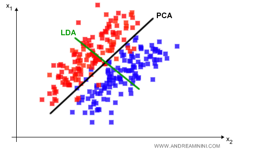La tecnica LDA è un mapping lineare dei dati supervisionato. L'obiettivo della tecnica LDA è individuare le dimensioni che discriminano meglio i pattern.Differenza tra PCA e LDA. In questo esempio riduco la dimensione da R2 a R1 usando le due tecniche LDA e PCA. Entrambe le tecniche lavorano su un mapping lineare ma individuano un iperpiano (segmento) completamente diverso. Pertanto, sono soluzioni alternative e complementari con pro e contro. La tecnica PCA conserva l'informazione mentre la tecnica LDA distingue meglio le due classi.
