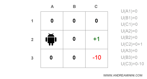 Supponiamo che l'agente subisca un costo pari a -0.10, ossia una ricompensa negativa, dopo ogni turno di gioco, fin quando non raggiunge l'obiettivo (C2).