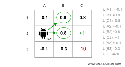 L'utilità dello stato B2 è uguale all'utilità attesa della migliore sequenza di azioni in grado di condurre il bot fino a C2.
