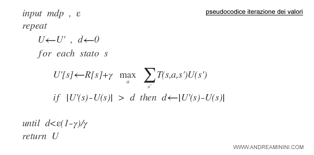 Dove mdp è l'insieme della mappa degli stati S e un modello di transizione T, mentre la variabile ε in input indica l'errore che consideriamo accettabile per una politica quasi-ottimale.