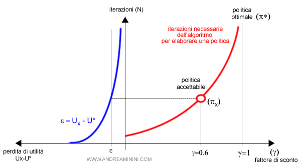 Attenzione. Il precedente diagramma non vuol dire che si deve settare il fattore di sconto γ a 0.6. Dimostra soltanto che dopo x iterazioni la differenza ε tra l'utilità della politica πx e quella ottimale (π*) è quasi nulla. Sarebbe irrazionale continuare con altre iterazioni (x+1) alla ricerca della politica ottimale, in quanto troppo dispendioso in termini di risorse e tempo. Dopo x iterazioni estrapola comunque una politica quasi ottimale ( politica accettabile ). Pur essendo tarato a un fattore di sconto γ=1 ( visione di lungo periodo ) ha una complessità simile a uno configurato a γ=0.6 ( visione di medio-breve periodo ). E' quindi più efficiente ed è efficace in modo accettabile. Per un approfondimento matematico sull'aggiornamento di Bellman.