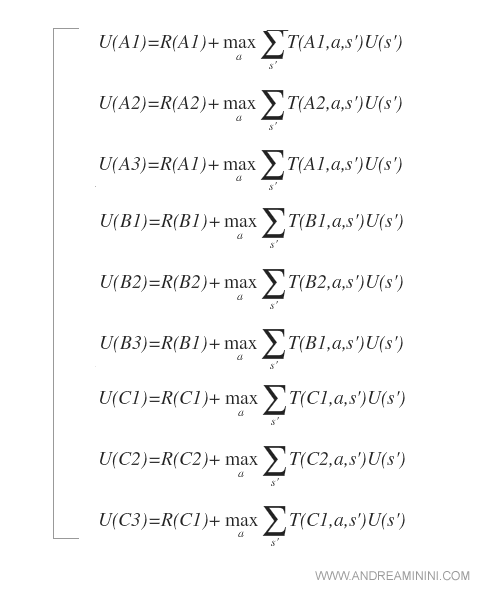 Ogni equazione ha una sola incognita ed è l'utilità dello stato successivo U(s') e l'algoritmo deve scegliere quello che massimizza l'utilità attesa tra tutti gli stati successivi possibili.