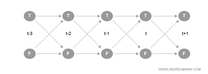 Facciamo un esempio pratico, il cammino che porta allo stato True nell'istante t include anche lo stato nell'istante precedente t-1.