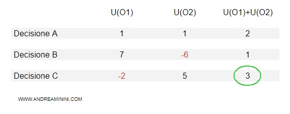 Esempio. L'agente razionale ha due obiettivi O1 e O2. Le decisioni A, B, C hanno un impatto diverso sui due obiettivi. La somma delle utilità positive e negative determina l'utilità attesa della decisione. L'agente razionale sceglie la decisione che massimizza l'utilità attesa. In questo caso l'agente opta per la decisione C.