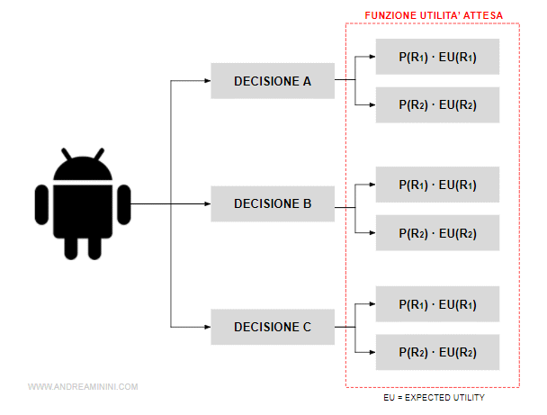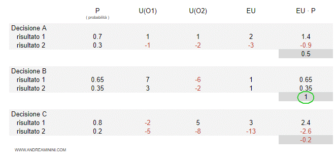 Esempio. Nel seguente esempio l'agente razionale prende in considerazione le probabilità dei risultati ottenuti di ogni scelta e l'impatto sulla funzione di utilità EU. La decisione B è la migliore perché massimizza l'utilità attesa.