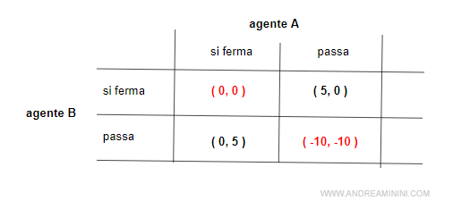 Esempio. Se i due agenti non concorrono a raggiungere per primi lo stesso obiettivo, uno dei due potrebbe razionalmente fermarsi per far passare l'altro e ridurre il rischio di incidente.