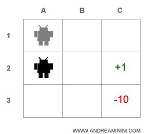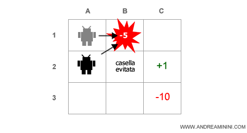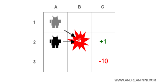 Esempio. I due agenti decidono contemporaneamente di spostarsi nella casella B2. Dal loro punto di vista, la casella B2 è vuota. Così facendo si scontrano, causandosi a vicenda un danno pari a -5.