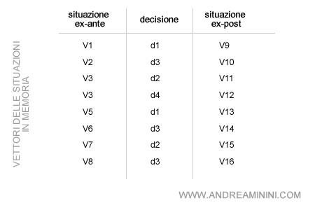 Nella memoria del software sono registrate tutte le situazioni che ha vissuto in passato, lo stato dell'ambiente iniziale ( vettore della situazione ex ante ), la decisione presa e come è cambiato lo stato dell'ambiente operativo ( feed-back ) dopo aver preso la decisione ( vettore della situazione ex-post ). La tabella seguente è l'esperienza passata del software intelligente.