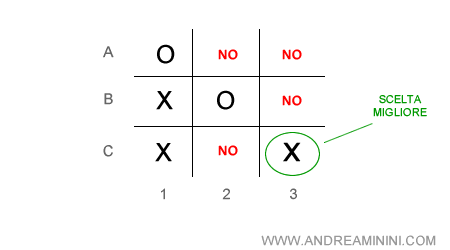 Pertanto, l'agente razionale prende la decisione di mettere la X nella casella C3, in quanto è quella con la probabilità di successo maggiore.