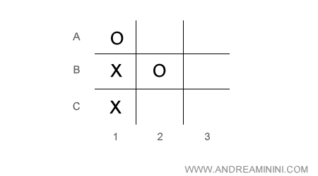 L'agente intelligente analizza i dati in memoria, trova le situazioni di gioco uguali a quella corrente, e scopre che 7 volte su 8 ha perso la partita quando ha deciso di mettere la X nelle caselle A2, A3, B3 e C2.