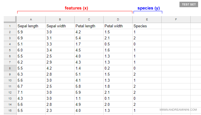 Nota. Il test set è composto da 30 esempi diversi dal training set. Il files CSV deve essere scaricato ( iris_test.csv ) e salvato in una cartella a propria scelta sul computer o su una pen drive.