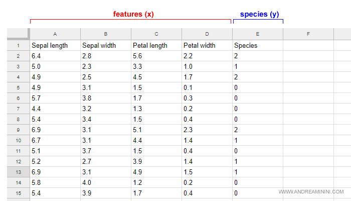 In ciascuna riga è anche indicato il codice della specie (setosa, virginica, versicolor) del relativo fiore Iris.