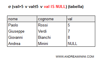 σ(val>5∨val≤5∨val IS NULL) (tabella)