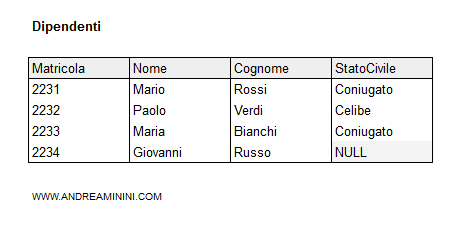 Questa tabella "dipendenti" ha quattro attributi: matricola, cognome, nome, stato civile