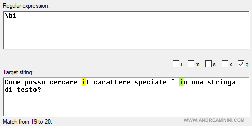 - Il backslash trasforma un carattere normale in una funzione. Ad esempio, la lettera "b" anteposta da una barra inversa diventa la funzione che trova i bordi della parola. Nel seguente esempio posso così trovare tutte le parole che cominciano con la lettera "i" minuscola.