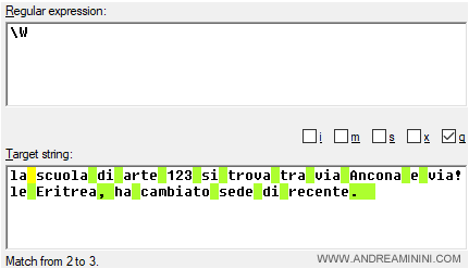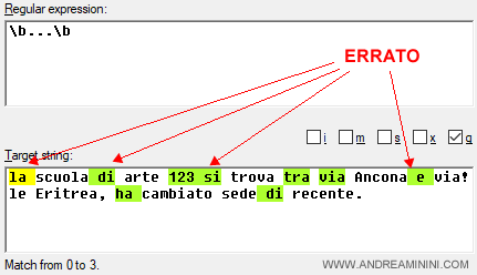 Nota. Se avessi usato il jolly (.) al posto del terminatore w, l'espressione regolare avrebbe selezionato anche i gruppi di tre caratteri composti da separatori. Non solo le parole di tre lettere. Quindi, in questo caso l'uso del terminatore w è stato indispensabile per raggiungere l'obiettivo perché individua soltanto i caratteri dentro una parola.