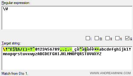 Quali caratteri seleziona il terminatore W? Il terminatore W seleziona tutti i caratteri tranne le lettere, i numeri e la sottolineatura.