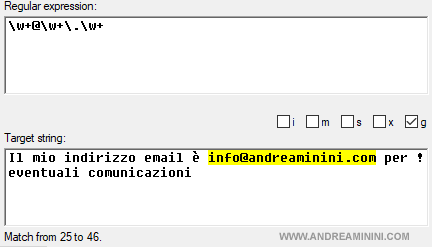 L'ultima parte ( \w ) seleziona l'estensione del dominio. Ad esempio, .it, .com, ecc.