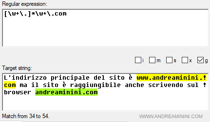 Esempio. La regex seleziona sia i domini con www che quelli senza. Grazie alla presenza del quantificatore *, l'assenza del www non pregiudica la selezione del nome di dominio prima dell'estensione ".com".