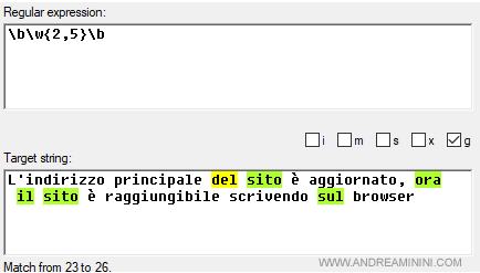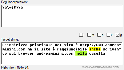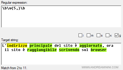 La precedente regex seleziona tutte le parole con 5 lettere o più. E' particolarmente utile se non conosco la lunghezza massima delle occorrenze.