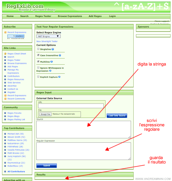 - RegExLib. E' un servizio online gratuito utilizzabile direttamente sul sito web regexlib.com. Ha il vantaggio di non richiedere alcuna installazione sul PC. Tuttavia, a differenza delle soluzioni software, per usare RegExLib bisogna avere sempre una connessione a internet attiva.