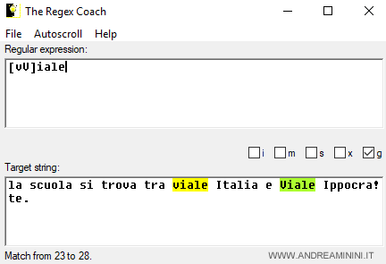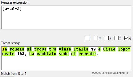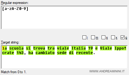 Nota. In questo modo ottengo lo stesso risultato della regex "viale|Viale" ma l'espressione è più corta. Se le combinazioni della stringa da cercare sono molte, il set di carattere accorcia l'espressione regolare a pochi caratteri.
